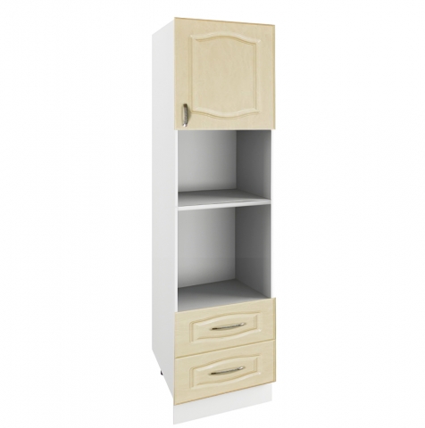 Кухонний пенал 60 ДШ LUX під духовку та мікрохвильову (h-720) кухні Оля Світ Меблів — оснащений одним закритим відділенням, відкритою нішею під духовку та мікрохвильову та двома висувними шухлядами з телескопічними направляючими повного висування, в пеналі можливо розмістити всі потрібні в господарстві речі. Корпус виготовляється з високоякісного ламінованого ДСП товщиною 16 мм у популярних колірних рішеннях корпусу: «білий», «дуб сонома», «графіт», «попелястий» та «дуб крафт золотий» з фасадами з високоякісного МДФ товщиною 16 мм у сміливих кольорових рішеннях на вибір: "біле дерево", "біле золото", "білий", "білий оксид", "білий супермат", "венге світлий", "венге темний", "блакитна лагуна", "графіт", "дуб сонома", "дуб трюфель", "клен", "льон", "горіх", "яблуня". Пенал привертає увагу свіжістю та елегантністю; декорованими різьбленими малюнками з плавними лініями; подовженими пластиковими ручками P-02/96 кольору сатин. Кухня Оля Світ Меблів стане справжнім місцем натхнення для приготування вишуканих страв щодня.
