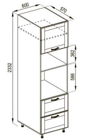 пенал містить одне закрите відділення з поличкою всередині, відкриті ніші під духовку та мікрохвильову та дві висувні шухляди |