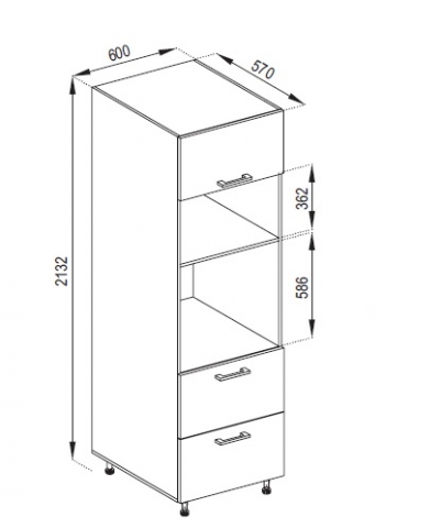 пенал містить одне закрите відділення, відкриті ніші під духовку та мікрохвильову та дві висувні шухляди |