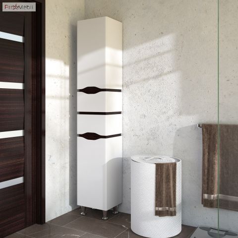 Пенал з кошиком для білизни в ванну кімнату 35 R Alessa венге Sanwerk чудово доповнить інтер’єр ванної кімнати і дозволить значно заощадити вільний простір у ванній кімнаті, а також дасть можливість помістити всі гігієнічні засоби, приховуючи їх від оточуючих. Пенал в своїй конструкції має одне закрите відділення з полицями всередині, дві висувні шухляди і кошик для білизни в нижній частині конструкції. Універсальний і функціональний пенал правобічний, кут відкриття 165 градусів. Корпус і фасади виготовлені з високоякісного МДФ товщиною 16 мм і пофарбовані фарбою італійського виробництва Sayerlack в кольорі "білого глянцю" з контрастними вставки в кольорі "венге". Характерними особливостями меблів є подвійні боковини в корпусі, замість традиційних ручок для відкривання використовуються виїмки в фасаді, декоровані з внутрішньої сторони контрастною планкою, практичний сірий колір всередині шухляд, стійкі ніжки, фурнітура високої якості Blum (Австрія), що забезпечує плавне, м'яке закриття і довгу, надійну роботу всіх рухомих частин. Меблі Alessa венге Sanwerk створять неповторний образ і ексклюзивний дизайн вашої ванної кімнати.