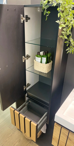 Пенал для ванної кімнати Milos 350 Fancy Marble стане стильним акцентом у вашому інтер'єрі, додаючи гармонію та функціональність. Корпус виконаний із міцного МДФ завтовшки 16 мм, вкритий вологостійкою ПВХ-плівкою, забезпечуючи надійний захист від вологи та довговічність в умовах ванної кімнати. Фасад із МДФ прикрашений шпонованою фанерою, що надає виробу особливої вишуканості та витонченого стилю. Матовий графітовий колір надає пеналу сучасного вигляду, який впишеться в більшість інтер'єрів, а також доступні варіанти в матовому і глянсовому білому виконанні. Оригінальні фрезеровані виїмки на фасаді замінюють традиційні ручки, надаючи меблям мінімалістичний і акуратний вигляд. Функціональність пенала продумана до дрібниць: одна висувна шухляда і закрите відділення з полицями забезпечують зручне зберігання різного приладдя. Механізми відкривання оснащені системою Soft Close, яка робить закривання плавним і безшумним, запобігаючи зношуванню та додаючи комфорт у щоденне використання. Пенал Milos 350 Fancy Marble втілює поєднання стилю і практичності, створюючи атмосферу затишку і порядку у вашій ванній кімнаті.