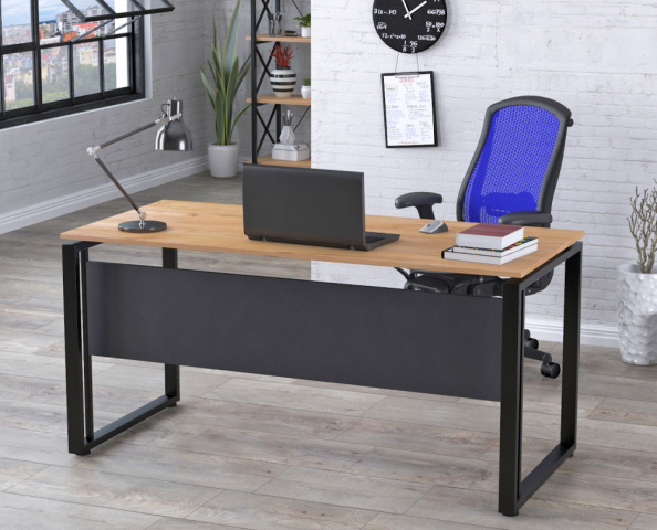 Письмовий стіл G-160-18 Loft Design - це покращений варіант письмового столу, доповнений царгой, яка не тільки закриває ноги, але і робить конструкцію столу більш стійкою і жорсткою. Стіл G-160-18 зберігає класичний зовнішній вигляд, але при цьому є не тільки містким і практичним, але і більш стійким! Ця модель столу відмінно підійде любителям просторого приміщення, прикрасить сучасний і лофт інтер'єр. Розміри стільниці моделі G-160-18 складають 1600х700 мм. Матеріал стільниці - ДСП з ламінованим покриттям, товщина 18 мм. Воно має високу зносостійкість і не вимагає особливого догляду. В наявності є кольори: венге луїзіана, горіх модена, дуб крафт золотий, дуб палена. Висота виробу становить 75,5 см. Каркас виготовлений з металевої труби з профілем 50х25 мм і пофарбований порошковою фарбою чорного кольору. Конструкція столу проста в збірці: дві боковини з'єднані між собою двома балками, на які кладеться стільниця, а царга між боковинами зміцнює каркас, роблячи його більш стійким. Регульовані ніжки дозволять виставити виріб на нерівній поверхні. На вибір покупця стіл може бути оснащений отвором для комп'ютерних кабелів чи ні. Стіл G-160-18 можна придбати окремо і в комплекті з іншими меблями колекції LoftDesign.