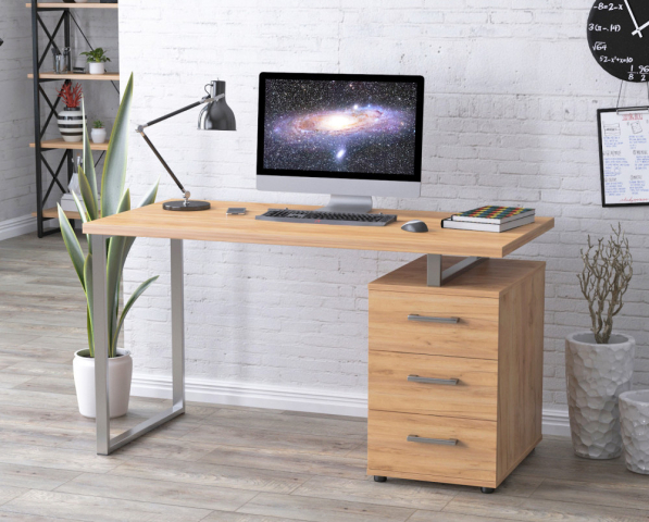 Письмовий стіл L-27 МАХ від компанії Loft Design - це збільшений варіант полюбилася всім моделі L-27. Стіл поєднує в собі бездоганний дизайн свого попередника і нові збільшені розміри. Металева конструкція зроблена з міцного металевого профілю 40*20 мм. Товщина металу 1,4 мм. Конструкція неймовірно міцна і, отже, довговічна. Каркас письмового столу L-27 MAX пофарбований сріблястою фарбою під хром. Простора стільниця і надійний каркас в поєднанні з теплими відтінками забарвлення ДСП точним чином відповідають стилю "лофт". Дана модель по стилю прекрасно впишеться в домашній інтер'єр або офісний кабінет. Широка стільниця дозволяє розмістити все необхідне для навчання / роботи: ноутбук, книги, настільну лампу і т.п. Тумба з трьома глибоким ящиками може бути зібрана як з правого, так і з лівого боку столу.