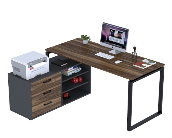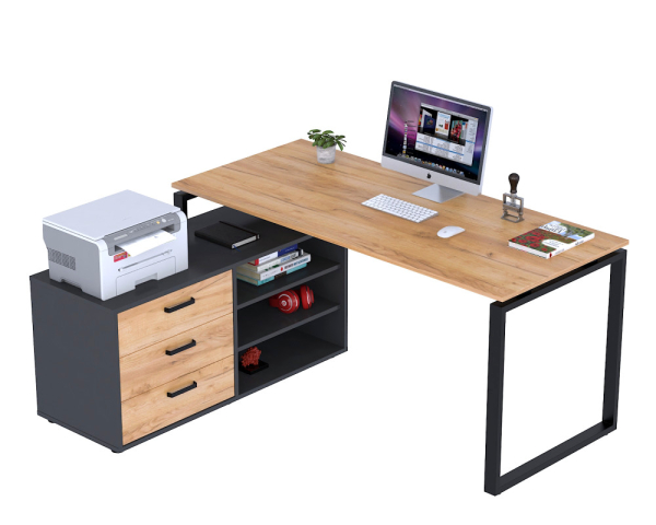 Кутовий стіл Open Office NDT-3S-160 Loft Design гармонійне втілення елегантності, практичності та сучасного стилю. Створений в естетиці лофт і модерн, він не просто оформляє робочий простір, а перетворює його в затишний і надихаючий куточок, де хочеться творити і досягати нових цілей. Стіл оснащений місткою тумбою з трьома висувними ящиками для зберігання важливих документів і дрібниць, а також додатковою тумбою з трьома відкритими нішами для речей, які повинні бути під рукою. Ергономічна стільниця з витонченим вирізом підтримує правильне положення рук, знижує навантаження на плечі і лікті, допомагаючи зберегти комфорт навіть у найнапруженіший день. Міцна конструкція каркаса виконана з холоднопрокатних металевих труб профілем 50×25 мм і траверси 60 мм, з товщиною стінок 1,5 мм. Покритий чорною порошковою фарбою, стійкою до подряпин і стирання, каркас не тільки надійний, але і підкреслює строгий, сучасний стиль столу. Стільниця з високоякісного ДСП товщиною 18 мм з ефектною імітацією текстури цінних порід деревини виглядає дорого і додає тепла інтер'єру. Краї захищені ПВХ-кромкою товщиною 2 мм, для додаткової довговічності і безпеки. Пластикові регульовані підкладки під ніжки оберігають підлогу від подряпин, а можливість швидкого і легкого складання робить установку справжнім задоволенням. У комплекті є все необхідне для складання — ви зможете відразу насолоджуватися новим робочим місцем.
