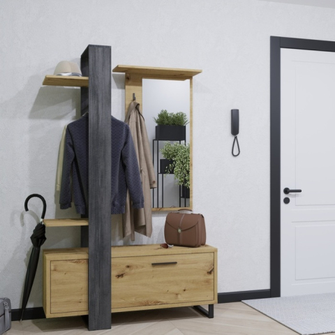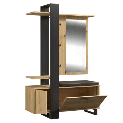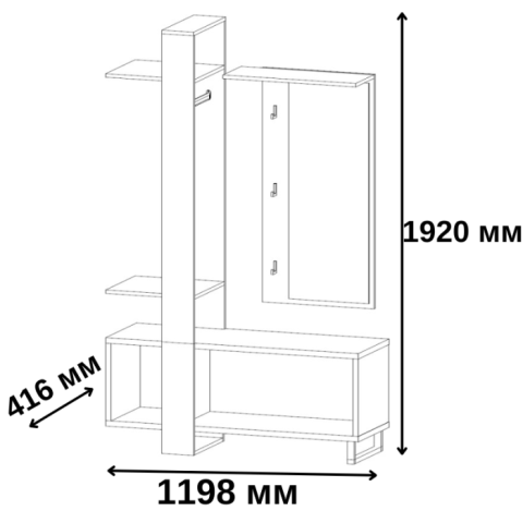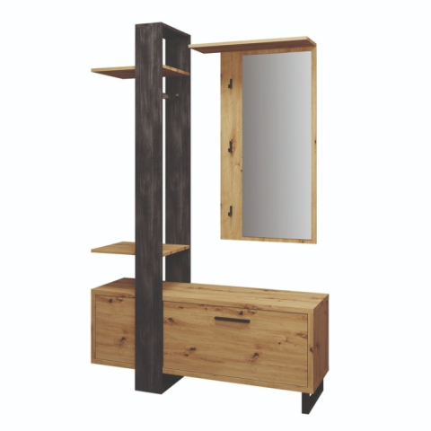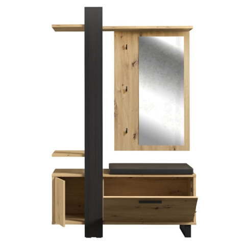 передпокій продається комплектом і складається з: настінної панелі з дзеркалом і трьома гачками, верхньої та бічної відкритих полиць, тумби з м’яким сидінням, закритого відділення ліворуч, відкидного відділення для взуття праворуч, а також перекладини за стійкою для вішалок |