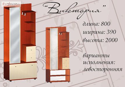 Передпокій Вікторія Майстер Форм - ідеальний і багатофункціональний варіант для невеликого передпокою. Передпокій Вікторія продається цільної конструкцією, яка лівостороння, і складається з наступних елементів: дзеркало, тумба для взуття, відкриті полиці, вішак і два висувні шухляди, які разом створюють унікальний меблевий гарнітур для передпокою. Корпус і фасади виготовляються з ламінованої ДСП. Гарнітур для вітальні Вікторія Майстер Форм випускається в цікавому поєднанні кольорів «дуб Сонома» з контрастними фасадами «білого» кольору. Головною особливістю колекції Вікторія є - строгі чіткі лінії, хромовані ручки та елегантними низькими регульованими ніжками, фірмовими петлями і роликовими напрямними. Всі елементи продумані до дрібниць дозволяють формувати унікальний меблевий комплект, який ідеально підійде для Вашого передпокою.