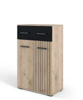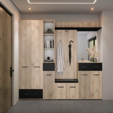 Передпокій Амбре Світ Меблів з унікальним трендовим дизайном від українського виробника Світ Меблів для стильного та функціонального облаштування інтер'єру передпокою. Корпус і фасадні частини виконані з якісного ламінованого ДСП у вишуканому поєднанні - благородного кольорі дуб білий з ефектними чорними вставками, що створюють гармонійний контраст, який привертає увагу. Меблева система для передпокою вирізняється низкою унікальних особливостей: сучасний дизайн меблів підкреслять рельєфні фасади, що надають поверхні текстури та роблять зовнішній вигляд виразнішим; чіткі геометричні форми додають елегантності й лаконічності; зручні продовгуваті ручки з міцного пластику вдало поєднують практичність та естетику; надійна фурнітура - петлі й напрямні повного висування, гарантують довговічність і зручність використання. Передпокій включає всі необхідні елементи, щоб створити зручний і функціональний простір: комод стане чудовим місцем для зберігання дрібниць, як-от аксесуари, ключі або документи; тумба для взуття допоможе акуратно розмістити ваше взуття, зберігаючи лад у передпокої; містка шафа ідеально підійде для верхнього одягу, включно з пальтами, куртками й плащами; вузький пенал забезпечить додаткове місце для речей, займаючи мінімум простору; підвісний вішак, стане зручним рішенням для швидкого розміщення повсякденного одягу; а панель із дзеркалом не тільки доповнить загальний дизайн, а й додасть практичності. Усі елементи колекції продумані так, щоб гармонійно поєднуватися між собою, створюючи затишний і стильний інтер'єр передпокою. Меблева система Амбре дуб білий Світ Меблів - зробить ваш передпокій стильним і затишним, створюючи атмосферу тепла й затишку, де кожен ваш вихід з дому починатиметься зі зручності та естетики. Купити меблі в передпокій Амбре дуб білий Світ Меблів можна в нашому інтернет-магазині ProMebli.ua з доставкою по всій Україні. Оплата за готівковий і безготівковий розрахунок, у кредит і розстрочку.