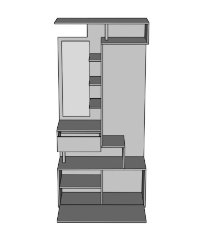 передпокій цільної конструкції складається з 1 елемента, який включає дзеркало, трюмо, висувну шухляду, гачки і полички |