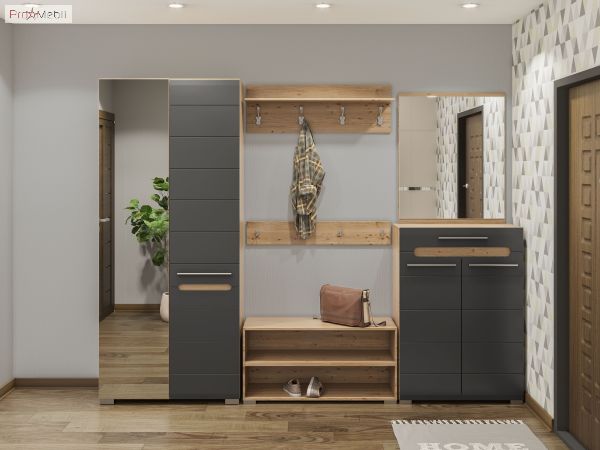 Передпокій Б'янко графіт Світ Меблів - елегантна та сучасна колекція українського виробника Світ Меблів для облаштування затишної вітальні. Корпус виготовляють із високоякісної ДСП товщиною 16 мм у природному кольорі «дуб артізан» з яскраво вираженим малюнком деревини, а контрастні «графітові» фасади з МДФ товщиною 16 мм гармонійно відтіняють дубовий відтінок і мають чудовий вигляд. Родзинкою колекції Бьянко графіт Світ Меблів є - прості геометричні форми; фасади з фрезеруванням, декоровані з внутрішнього боку контрастною планкою; довгі пластикові ручки кольору сатин; акуратні, невеликі пластикові ніжки; фірмові петлі, які забезпечують м'яке та безшумне закриття дверцят, висувні шухляди обладнано телескопічними направляючими. Всі елементи колекції можна вільно комбінувати на свій розсуд, переставляти, міняти місцями, купувати додаткові предмети за потребою для облаштування всього будинку в єдиному стилі. Меблі Бьянко графіт Світ Меблів вигідно вписуються в будь-який інтер'єр і здатні стати родзинкою вашої оселі.