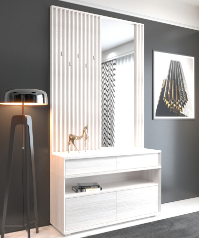Передпокій Делі ясен сніжний Gerbor - гармонійне втілення стилю, комфорту та продуманої функціональності для тих, хто прагне створювати атмосферу затишку вже з перших кроків у домі. Елегантна настінна вішалка з дзеркалом і шухлядами доповнюється функціональною тумбою для взуття, утворюючи завершене рішення для оформлення передпокою. Витончена рейкова панель вішалки оснащена п'ятьма надійними гачками EteraPlast, які допомагають акуратно розмістити верхній одяг, зберігаючи порядок і легкість простору. Велике дзеркало завтовшки 3 мм візуально розширює приміщення і наповнює його світлом, а компактна тумба з двома висувними шухлядами під ним стане зручним місцем для зберігання дрібниць. Функціональність передпокою доповнює тумба для взуття KOM2K, виконана в єдиному стилі. Вона обладнана двома відкидними дверцятами, тумба допоможе підтримувати порядок у зберіганні взуття, роблячи ранкові збори ще більш комфортними. Завдяки можливості дзеркальної збірки вішалки, конструкцію можна легко адаптувати під особливості планування вашого будинку. Настінний монтаж надає всім меблям відчуття легкості та полегшує прибирання. Світлий відтінок ясен сніжний, що надає простору відчуття легкості й чистоти, акцентуючи сучасну витончену естетику. Корпус і фасади виготовлені з якісної ламінованої ДСП, стійкої до повсякденних навантажень, а задня стінка і дно шухляд - з міцної ДВП завтовшки 3 мм, що витримує довгі роки експлуатації. Механізми Push to Open Magnet HETTICH дають змогу відчиняти шухляди та дверцята легким натисканням, а кулькові напрямні повного висування HAFELE забезпечують плавність ходу та довговічність використання, а надійні навісні петлі HETTICH, забезпечують безшумне відчинення. Передпокій Делі ясен сніжний Gerbor - дбайливо продумана композиція затишку і стилю, що створює відчуття гостинності та затишку у вашому домі.