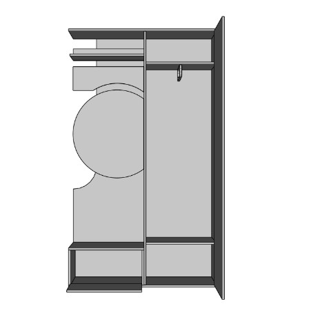 передпокій представлений цілісною конструкцією з високою шафою із дзеркальною панеллю для одягу і відкритою зоною з гачками та зручною тумбою-лавкою для зберігання взуття |
