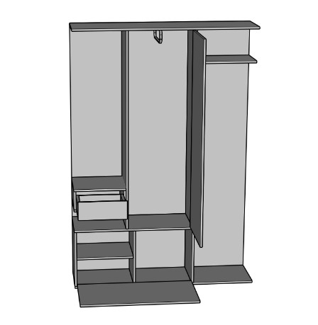 передпокій представлений цільною конструкцією з високою шафою із дзеркальною панеллю для одягу, двома відкритими зонами з гачками, висувною шухлядою і відкритою нішею, а також зручною тумбою для зберігання взуття |