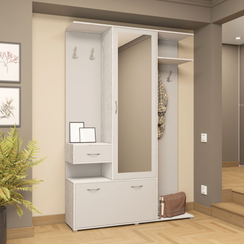 передпокій представлений цільною конструкцією з високою шафою із дзеркальною панеллю для одягу, двома відкритими зонами з гачками, висувною шухлядою і відкритою нішею, а також зручною тумбою для зберігання взуття |