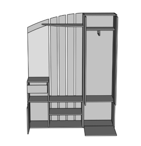 передпокій представлений цільною конструкцією з високою шафою для одягу, дзеркальним модулем з висувною шухлядою, нішею для дрібниць і закритим відділенням, а також відкритою зоною з гачками і зручною тумбою-лавкою для зберігання взуття |