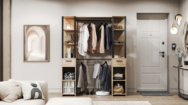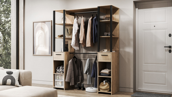 Передпокій Катя 2 Світ Меблів - стильний і функціональний елемент інтер'єру в індустріальному стилі, який додасть вашому передпокою атмосфери затишку й елегантності. Корпус і фасади виконані з високоякісного ламінованого ДСП товщиною 16 мм у стильній комбінації дуб крафт сірий із чорними деталями, що надає меблям сучасного та елегантного вигляду. Комплект передпокою містить дві відкриті секції з висувними шухлядами, з'єднані між собою штангами для підвішування одягу, що забезпечує достатньо місця для зберігання речей і підтримання порядку в передпокої. Передпокій поєднує в собі елементи сучасного дизайну і природну гармонію, що робить його ідеальним доповненням для будь-якого інтер'єру, а його стильний і практичний вигляд підходить як для міських квартир, так і для заміських будинків. Відкрита конструкція надає легкість і свободу в просторі, а універсальні та функціональні деталі дозволяють зручно використовувати кожен елемент. Передпокій Катя 2 Світ Меблів стане не тільки стильним акцентом вашого будинку, а й продуманим функціональним рішенням для повсякденного використання. Купити передпокій Катя 2 Світ Меблів можна в нашому інтернет-магазині ProMebli.ua з доставкою по всій Україні. Оплата за готівковий і безготівковий розрахунок, у кредит і розстрочку.