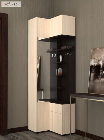 Передпокій Лабіринт Майстер Форм - ідеальний і багатофункціональний варіант для невеликого передпокою. Передпокій Лабіринт продається цільної конструкцією, яка може бути правобічною і лівобічною, і складається з наступних елементів: шафа з дзеркалом, тумба для взуття, закрите відділення, вішак з гачками, які разом створюють унікальний меблевий гарнітур для передпокою. Корпус і фасади виготовляються з ламінованої ДСП. Гарнітур для передпокою Лабіринт Майстер Форм випускається в ніжному кольорі «дуб молочний/венге магія». Головною особливістю колекції Лабіринт є - строгі чіткі лінії, відсутність ручок, їх роль виконує верхній торець фасаду і елегантні низькі регульовані ніжки, фірмові петлі і роликові напрямні. Всі елементи продумані до дрібниць дозволяють формувати унікальний меблевий комплект, який ідеально підійде для Вашого передпокою.