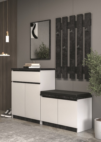 Передпокій Мія Світ Меблів - ідеальний набір меблів, що поєднує універсальність з мінімалістичним стилем від українського виробника Світ Меблів для облаштування затишного передпокою, відповідно до Ваших потреб та бажань. Корпус та фасадні частини виготовляються з якісного ламінованого ДСП товщиною 16 мм у вражаючому поєднанні білого кольору "німфея альба" з контрастними вставками "бетон темний" - внісши сучасний акцент і креативний стиль лофт. Колекція привертає увагу естетично цікавим стилем та дизайном; чіткими геометричними формами, що підкреслюють стриманість та мінімалізм; контрастне поєднання кольорів; відсутністю ручок, їх роль виконують фрезеровані на фасадах виїмки; міцною основою, що сприяє максимальній стійкості; фірмовими комплектуючими: петлями та напрямними повного висування, що забезпечують максимальну зручність у використанні. В модульний набір входять такі модулі: ергономічні тумба та тумба для взуття, елегантне дзеркало та навісна вішалка. Усі модулі можна комбінувати один з одним, створюючи унікальні композиції та адаптуючи їх до будь-якого простору. Меблі Мія Світ Меблів нададуть вашому інтер'єру стильності та актуальності, і зроблять Ваш інтер'єр Вашим. Купити меблі Мія Світ Меблів можна у нашому інтернет-магазині ProMebli.ua з доставкою по всій Україні. Оплата за готівковий та безготівковий розрахунок, у кредит та розстрочку.