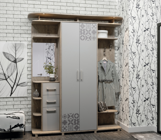 Передпокій Силует 3 Світ Меблів - стильне та зручне рішення, що ідеально поєднує класичну елегантність із сучасними елементами, перетворюючи передпокій на не лише функціональний, а й декоративний простір вашої оселі. Виготовлена з міцного ламінованого ДСП завтовшки 16 мм, у поєднанні благородного відтінку «дуб крафт сірий», що привнесе в простір тепло та природність, з фасадами в «попелястому» кольорі з витонченим декоративним малюнком, що додає композиції легкість та повітряність. Однією з головних особливостей моделі є фігурний карниз із вбудованим підсвічуванням, що створює м'яке та затишне освітлення, вбудоване дзеркало візуально розширить простір, а зручні довгасті пластикові ручки та пластикові ніжки підкреслять сучасний стиль меблів.