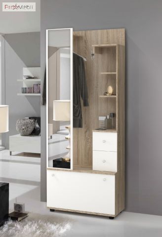 Передпокій Вікторія Майстер Форм - ідеальний і багатофункціональний варіант для невеликого передпокою. Передпокій Вікторія продається цільної конструкцією, яка лівостороння, і складається з наступних елементів: дзеркало, тумба для взуття, відкриті полиці, вішак і два висувні шухляди, які разом створюють унікальний меблевий гарнітур для передпокою. Корпус і фасади виготовляються з ламінованої ДСП. Гарнітур для вітальні Вікторія Майстер Форм випускається в цікавому поєднанні кольорів «дуб Сонома» з контрастними фасадами «білого» кольору. Головною особливістю колекції Вікторія є - строгі чіткі лінії, хромовані ручки та елегантними низькими регульованими ніжками, фірмовими петлями і роликовими напрямними. Всі елементи продумані до дрібниць дозволяють формувати унікальний меблевий комплект, який ідеально підійде для Вашого передпокою.