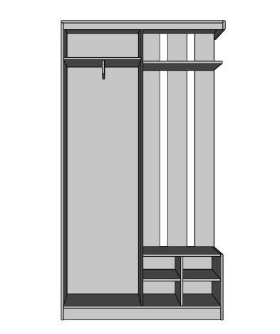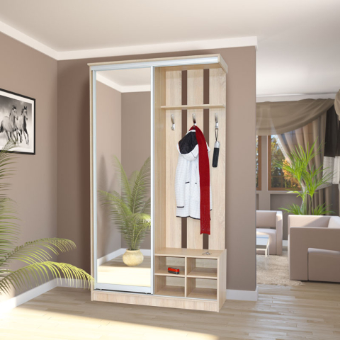 передпокій представлений цілісною конструкцією з високою шафою-купе для одягу та відкритою зоною з гачками для верхнього одягу зі зручною тумбою-лавкою з місцем для зберігання взутт |