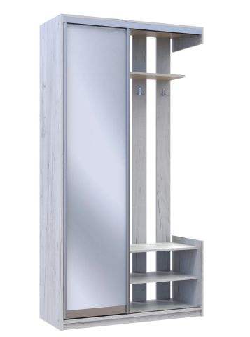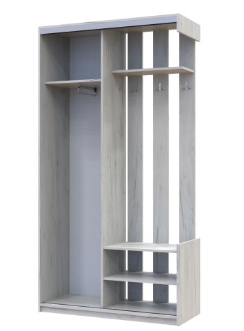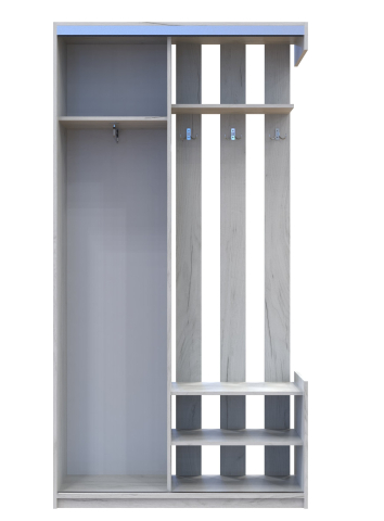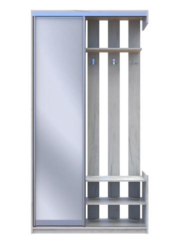 передпокій представлений цільною конструкцією, складається з: шафи з висувною штангою для вішалок, полиць для взуття та вішака з гачками та полицею для головних уборів |