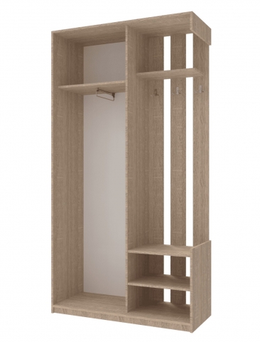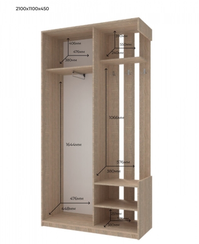 передпокій представлений цільною конструкцією, складається з: шафи з висувною штангою для вішалок, полиць для взуття та вішака з гачками та полицею для головних уборів |