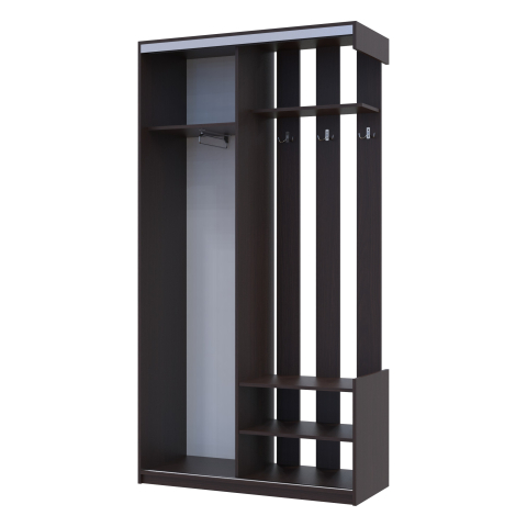 передпокій представлений цільною конструкцією, складається з: шафи з висувною штангою для вішалок, полиць для взуття та вішака з гачками та полицею для головних уборів |
