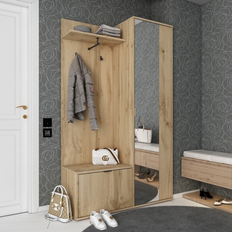 Компактний та сучасний передпокій Дора Doros представлений цільною конструкцією складається з 1 елемента, який включає шафу з висувною штангою для вішалок, тумбу для взуття і вішалки з гачками та з полицею для головних уборів. Меблі Дора Doros зроблять передпокій по-справжньому функціональним і стильним.