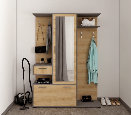 передпокій представлений цільною конструкцією, складається з: шафи з висувною штангою для вішалок, тумби для взуття, однієї висувної скриньки та вішалки з гачками з полицею для головних уборів |