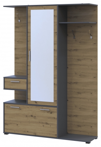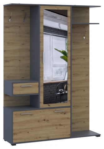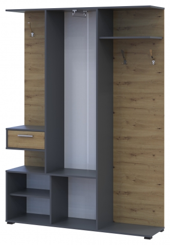 Компактний та сучасний передпокій Фінч Doros представлений цільною конструкцією складається з 1 елемента, який включає шафу з висувною штангою для вішалок, тумбу для взуття, одну висувну шухляду і вішалки з гачками та з полицею для головних уборів. Стильний та універсальний передпокій Фінч Doros відповідає запитам Всієї родини в плані комфорту, місткості та естетики.