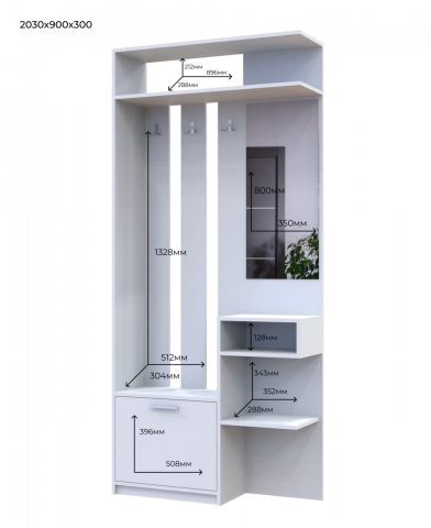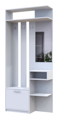 передпокій представлений цільною конструкцією, складається з: тумби для взуття, відкритих полиць та вішака с дзеркалом, гачками та полицею для головних уборів |