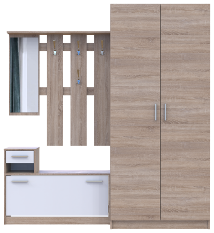 Передпокій Alice з шафою Promo 2 ДСП Doros - справжній майстер організації простору. Передпокій продається комплектом і складається з: тумби і вішалки з дзеркалом, гачками і полицею для головних уборів і шафи з одним відділення зі штангою для вішалок, зверху полиця антресоль. Тумба компактно зберігає взуття, позбавляючи від безладу на підлозі, і створює акуратну зону біля входу. Вішалка з дзеркалом - ідеальний помічник для останнього погляду перед виходом, а гачки дбайливо утримують ваш верхній одяг, звільняючи руки. Полиця для головних уборів додає завершального штриха, зручно розміщуючи шапки та капелюхи. Шафа з одним відділенням і штангою для вішалок приховує сезонний одяг, дозволяючи йому завжди бути у чудовій формі. Верхня антресольна полиця - це ідеальне місце для зберігання речей, до яких потрібен рідкісний доступ, чи то валізи, чи то коробки з сезонними аксесуарами. Передпокій Alice / Promo Doros ідеальне рішення для тих, хто цінує порядок і функціональність, не жертвуючи при цьому стилем, створюючи відчуття затишку і завершеності інтер'єру.