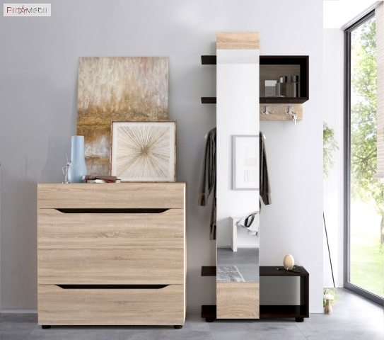 Комплект меблів в передпокій Аякс Майстер Форм - стильний і сучасний від українського виробника Майстер Форм для облаштування вітальні. Корпус і фасадні частини виготовлені з якісного ламінованого ДСП, в безпрограшному поєднанні світлих і темних відтінків: дуб молочний або дуб сонома з венге магія. Торцеві поверхні всіх внутрішніх і зовнішніх елементів виробів облицьовані пластиковою кромкою, надаючи меблям завершений гарний і доглянутий вигляд. Меблі Аякс Майстер Форм привертають увагу своїм легким і сучасним дизайном; простими прямокутними формами; застосуванням двокольорової гами; відсутністю традиційних ручок для відкривання, їх роль виконують виїмки в фасаді, декоровані з внутрішнього боку контрастною планкою; пластиковими регульованими ніжками; фірмовими комплектуючими: телескопічними напрямними і фірмовими завісами, які забезпечують максимальний комфорт у використанні. Комплект включає в себе підлоговий вішак і місткий комод. Всі елементи можна вільно комбінувати на свій розсуд, переставляти, міняти місцями, здобувати додаткові предмети в разі потреби для облаштування всього будинку в єдиному стилі. Меблі Аякс Майстер Форм чудово прикрасять інтер'єр Вашого будинку і дозволять підкреслити Вашу індивідуальність. Купити модульну систему Аякс Майстер Форм можна в нашому інтернет-магазині ProMebli.ua з доставкою по всій Україні. Оплата за готівковий і безготівковий розрахунок, в кредит або розстрочку.