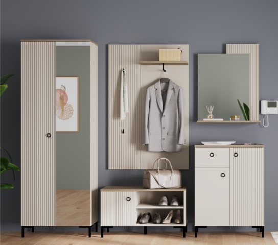 Передпокій Dominica Mebel Bos (Домініка Меблі Бос) - це справжній шедевр витонченого стилю й елегантності, що ідеально підходять для створення затишної та функціональної атмосфери у передпокої. Корпус виготовляється з якісного ламінованого ДСП товщиною 16 мм у благородному сіро-коричневому кольорі «тауп», з легким шоколадним відтінком, що додасть інтер'єру м'якості та витонченості, зі стільницею з якісного ламінованого ДСП товщиною 18 мм у кольорі «дуб сильверджек», створюючи контрастний акцент, підкреслюючи природну текстуру дерева і надаючи меблям відчуття надійності та довговічності, з комбінованими фасадами з ламінованого ДСП товщиною 16 мм і МДФ товщиною 19 мм. Колекція приваблює і заворожує своїм сучасним мінімалістичним дизайном; поєднанням гладких корпусів і ребристих фасадів, що створюють тактильний ефект і візуальну глибину; чорними металевими ручками-кнокерами, які надають виробам індустріального шарму та дизайнерської вишуканості; чорними пластиковими Г-подібними ніжками, які додають меблям візуальної легкості, зберігаючи водночас міцність та надійність; фірмовими комплектуючими: кульковими напрямними повного висування й петлями, що роблять меблі функціональнішими та довговічнішими. Передпокій складається з різноманітних елементів: комода для зручного зберігання речей; шафи для одягу, що забезпечує порядок у гардеробі; навісного вішака для компактного зберігання одягу; тумби для взуття, що допомагає організувати простір і дзеркала з полицею. Всі елементи мають єдиний стиль і можуть бути скомбіновані відповідно до ваших особистих уподобань і особливостей простору вашого будинку. Домініка Меблі Бос - це комплексне рішення для створення затишного і сучасного інтер'єру з акцентом на стиль і практичність. Купити меблі Dominica Mebel Bos можна в нашому інтернет-магазині ProMebli.ua з доставкою по всій Україні. Оплата за готівковий і безготівковий розрахунок, у кредит, розстрочку або оплату частинами від ПриватБанк.