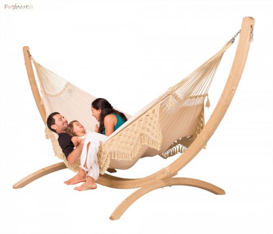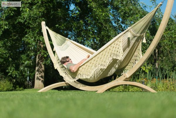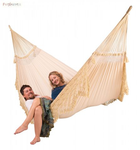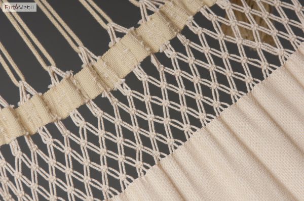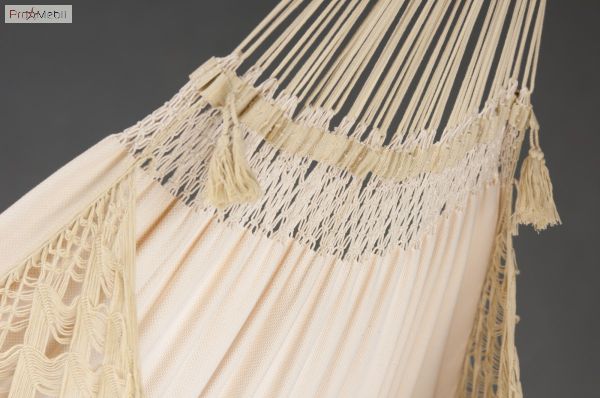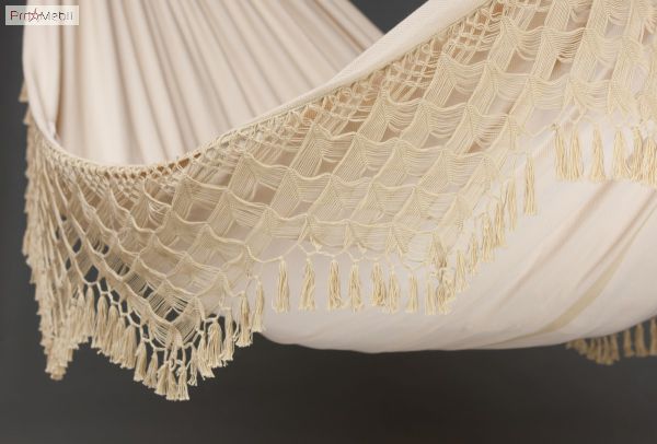 Великолепный подвесной гамак Bossanova champagne из био-хлопка, очень большой, мягкий и удобный. Благодаря своей эластичности ткань плотно облегает тело. Типичным элементом бразильского подвесного гамака является плетёная сетка, украшенная бахромой, а также, большое количество шнуров для подвешивания, которые оптимально распределяют вес вашего тела в гамаке и гарантируют удобный отдых.