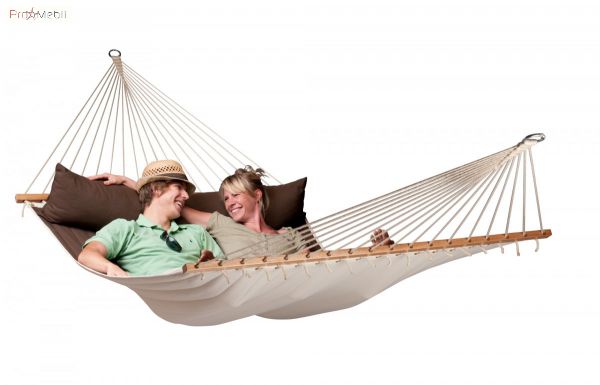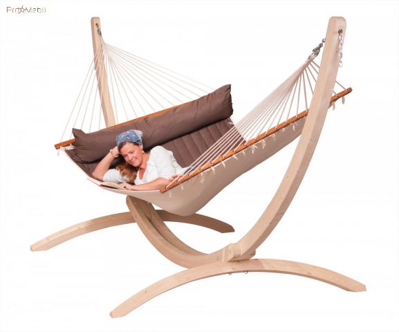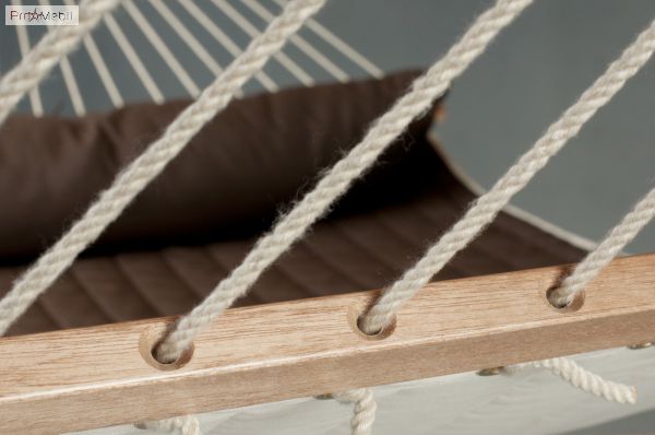 Alabama arabica - удобный и погодостойкий подвесной гамак особо больших размеров в американском стиле из полипропилена, со съёмной подушкой для отличного отдыха. Он изготовлен из HamacTex, обладающего защитой от ультрафиолетовых излучений и водоотталкивающими свойствами. Этот материал на ощупь едва отличается от ткани из хлопка. Рейки для гамака изготовлены из древесины, выращенной экологически чистым способом в соответствии со стандартами международной организации (FSC).