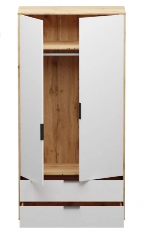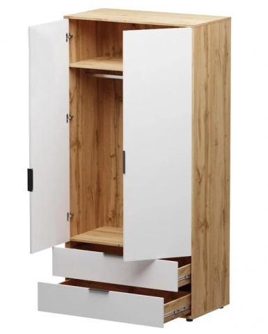 шафа містить дві висувні шухляди та одне закрите відділення зі штангою для вішалок усередині |