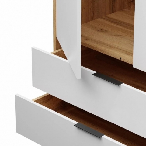 Елегантна та сучасна шафа 2Д2Ш Нітро біла Сокме дозволить створити оригінальний та гарний простір у передпокої. Шафа містить дві висувні шухляди та одне закрите відділення зі штангою для вішалок усередині. Колекція привертає увагу: лаконічним стриманим стилем; чіткими лініями; поєднанням корпусу дуб вотан з білими фасадами; оригінальними ручками чорного кольору, інтегрованими в край фасаду; стійкими ніжками; фірмовими комплектуючими. Меблі Нітро біла Сокме - практичне рішення для сучасного інтер'єру, яке не тільки прикрасить простір, але і забезпечить додаткове місце для зберігання.