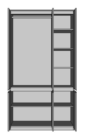 шафа зонована на дві секції - верхню і нижню: верхня секція включає просторе відділення з полицями і подвійне відділення зі штангою для вішалок, нижня секція оснащена місткими полицями |