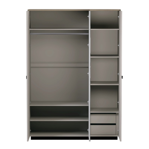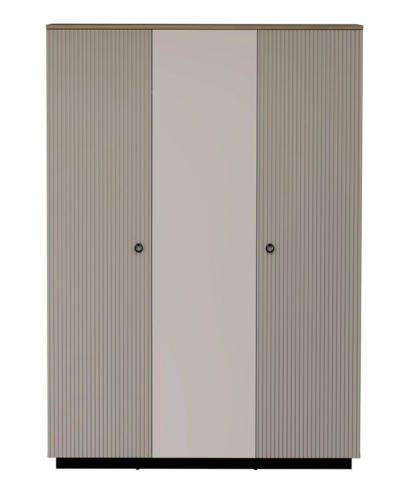 Шафа 3D Dominica Mebel Bos - справжній шедевр витонченого стилю й елегантності, яка ідеально підходить для створення затишної та функціональної атмосфери у вітальні, їдальні, спальні, робочому кабінеті, підлітковій кімнаті й навіть у передпокої. Тридверна шафа оснащена одинарною секцією з поличками і шухлядками для зручного зберігання дрібниць, а також подвійною секцією зі штангою для вішалок і додатковими поличками. Шафа приваблює своїм сучасним мінімалізмом; гладким корпусом з ребристими фасадами, що створюють тактильну глибину; чорними металевими ручками-кнокерами, що додають індустріальний шарм; а фірмові комплектувальні, кулькові напрямні повного висування та петлі, забезпечують довговічність та функціональність меблів. Колекція Домініка Меблі Бос - це комплексне рішення для створення затишного і сучасного інтер'єру з акцентом на стиль і практичність.