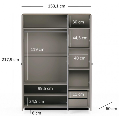 шафа містить одинарну секцію з поличками та шухлядками, а також подвійну секцію зі штангою для вішаків і поличками |