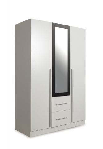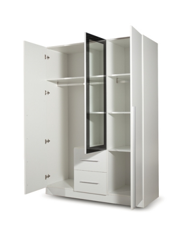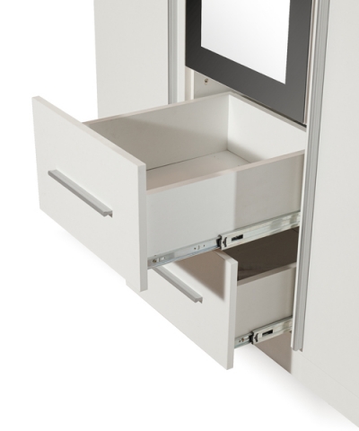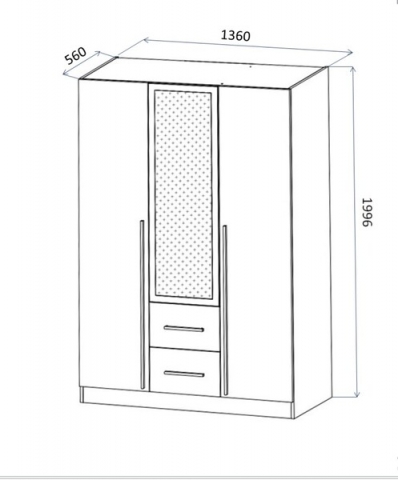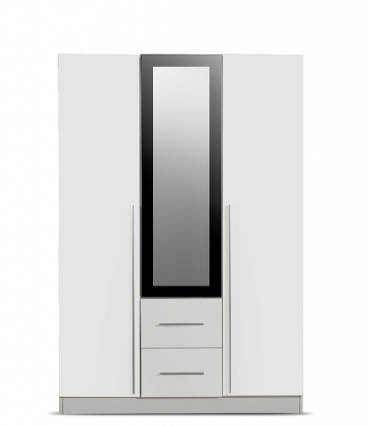 Тридверна шафа Крефельд Embawood забезпечить безпеку та порядок Вашого гардеробу. Шафа має три відділення: одинарну секцію з поличками та невеличкою штангою для вішаків, подвійну секцію зі штангою для вішаків та полицею, та відділення з двома висувними шухлядами. Фасад прикрашає дзеркало. Корпус та фасадні частини виготовлені з якісного ламінованого ДСП товщиною 18 мм, у білому кольорі. Шафа привертає увагу вишуканістю та мінімалістичністю; довгастими ручками сріблястого кольору; міцною основою, що сприяє максимальній стійкості; фірмовими комплектуючими: завіси та телескопічні напрямні забезпечують максимальний комфорт у використанні. Шафа 3Д Крефельд Embawood порадує якістю виконання, універсальністю та привнесе в будь-який інтер'єр ергономічність та елегантність.