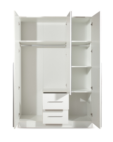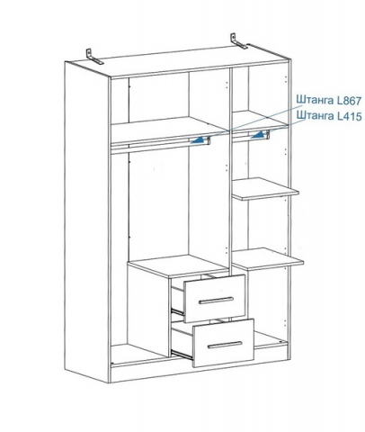 шафа містить дві висувні шухляди, одинарну секцію с поличками та невеличкою штангою для вішаків, подвійну секцію зі штангою для вішаків і поличкою |