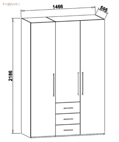 шафа містить три висувні шухляди, одинарну секцію с поличками, подвійну секцію зі штангою для вішаків і поличкою |