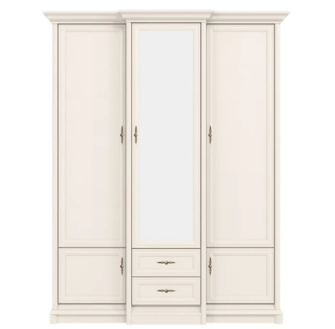 шафа складається із трьох секцій: центральна частина - вгорі закрите відділення зі штангою для вішалок, на фасадній частині розташоване дзеркало, знизу – дві висувні шухляди; в бічних секціях вгорі знаходиться по три полиці в кожній, знизу закриті відділення |