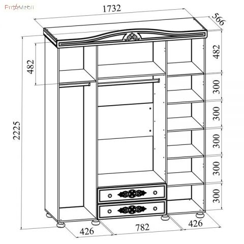 праворуч встановлено п’ять полиць, в решті відділень - полиця і штанга для вішалок, знизу дві висувні шухляди |