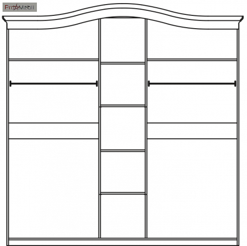 шафа містить три відділення: в центральній частині одинарне відділення з низкою зручних містких полиць, з боків подвійні відділення зі штангою для вішалок і полицею антресоллю |