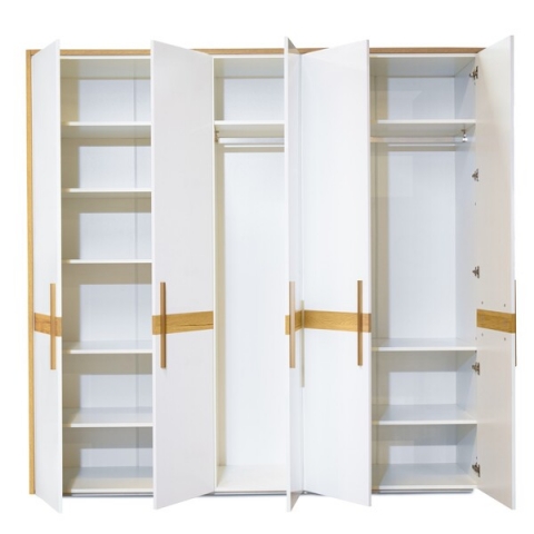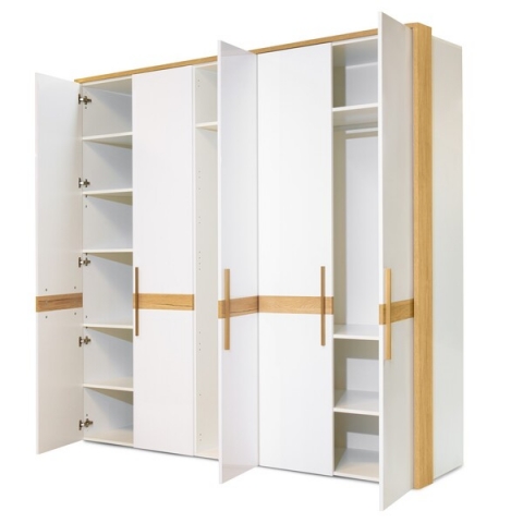 Шафа 5Д Сієрра Embawood - функціональний предмет меблів, що дозволяє розмістити необхідні речі, який гармонійно впишеться в інтер'єр вітальні, спальні та передпокою. Шафа включає в себе три відділення: відділення з полицями; відділення зі штангою та полицею антресоллю та відділення зі штангою, полицями та полицею антресоллю, які дозволять вам ідеально розмістити Ваші речі, щоб ви могли легко знайти все і зберегти ідеальний порядок. Корпус та фасади виготовляються з якісного ламінованого ДСП завтовшки 16 мм у поєднанні кольорів білий / дуб санремо, таке поєднання відтінків зроблять його ідеальним для сучасних концепцій інтер'єру. Шафа 5Д Сієрра Embawood чудово гармонує в сучасному дизайні, завдяки чому шафа відмінно впишуться у більшість сучасних інтер'єрів і наповнить квартиру шармом та натхненням.