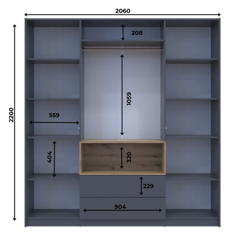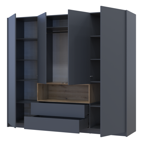 шафа містить п’ять відділень: два відділення із закритими полицями, відділення зі штангою для вішалок, відділення з висувними шухлядами і відриту нішу |