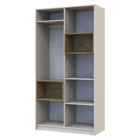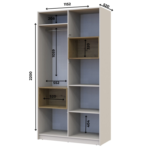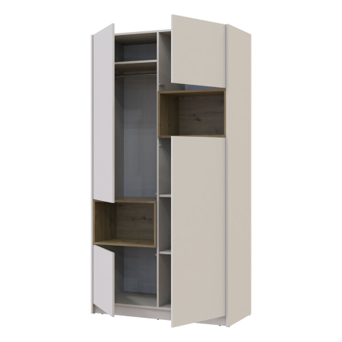 шафа містить чотири відділення: відділення із закритими полицями, відділення зі штангою для вішалок і відриті ніші |